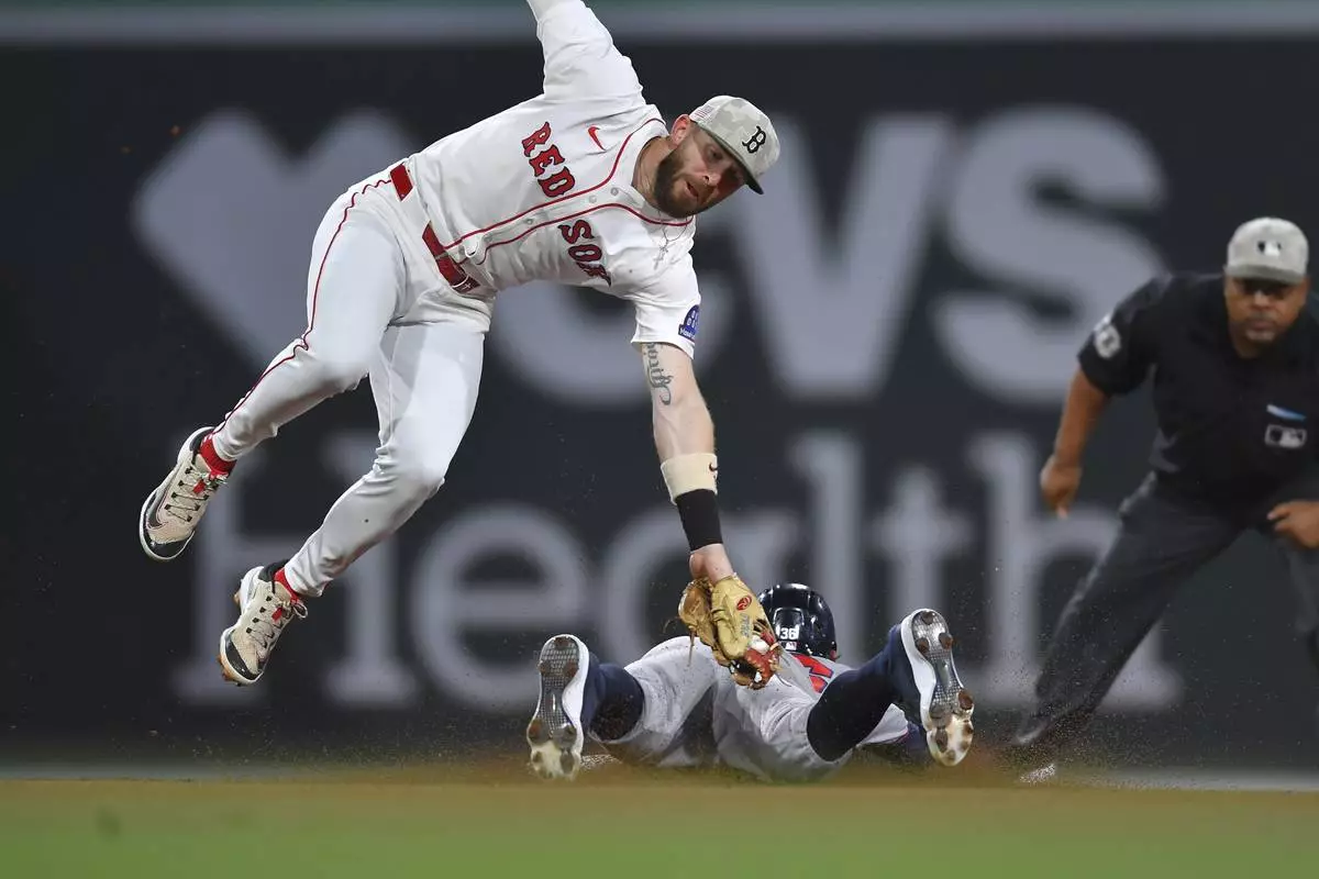 Boston Red Sox shortstop Trevor Story, top left, is unable to get his glove on Atlanta Braves' Eli White, bottom, as White steals second base in the fourth inning of a baseball game, Saturday, May 17, 2025, in Boston. (AP Photo/Steven Senne)