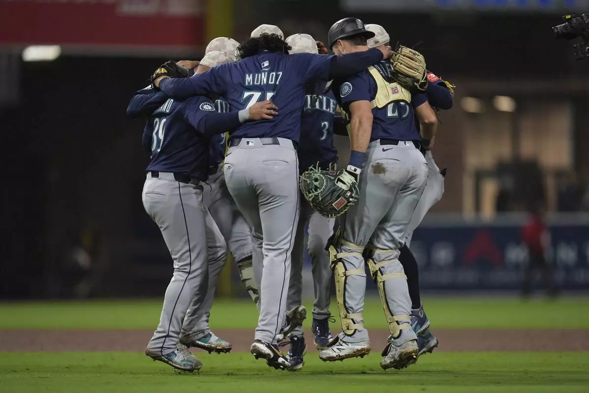Members of the Seattle Mariners celebrate after the team defeated the San Diego Padres 4-1 in a baseball game Saturday, May 17, 2025, in San Diego. (AP Photo/Gregory Bull)