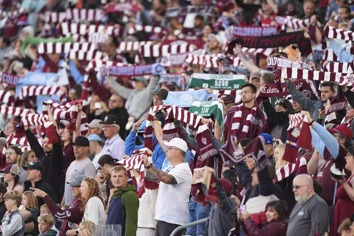 Spectators cheer as the Colorado Rapids take the pitch to face Real Salt Lake in an MLS soccer match Saturday, May 17, 2025, in Commerce City, Colo. (AP Photo/David Zalubowski)