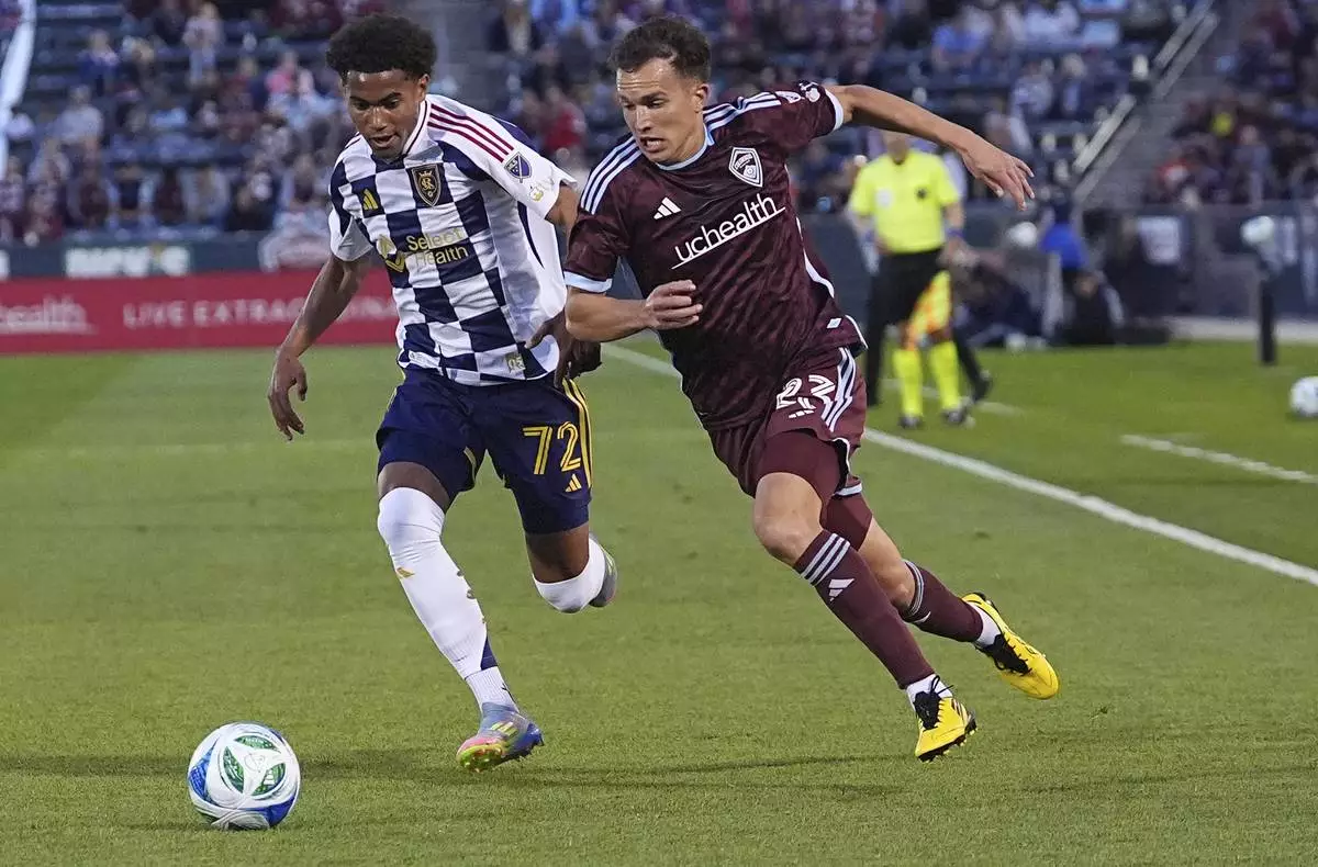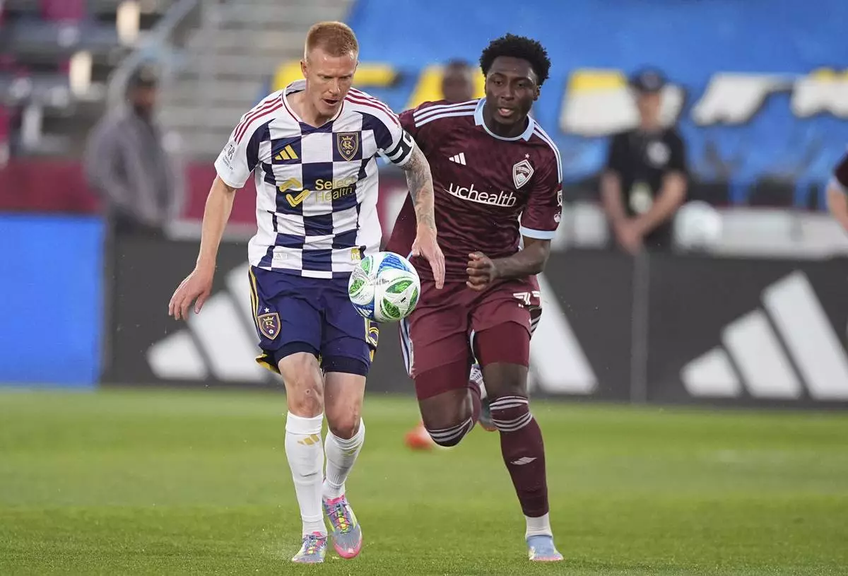 Colorado Rapids midfielder Cole Bassett, right, drives past Real Salt Lake forward Zavier Gozo, left, in the first half of an MLS soccer match Saturday, May 17, 2025, in Commerce City, Colo. (AP Photo/David Zalubowski)