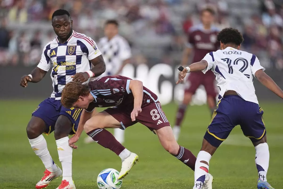 Colorado Rapids midfielder Oliver Larraz, center, struggles to control the ball while driving between Real Salt Lake striker William Agada, left, and forward Matthew Bell, right, in the first half of an MLS soccer match Saturday, May 17, 2025, in Commerce City, Colo. (AP Photo/David Zalubowski)