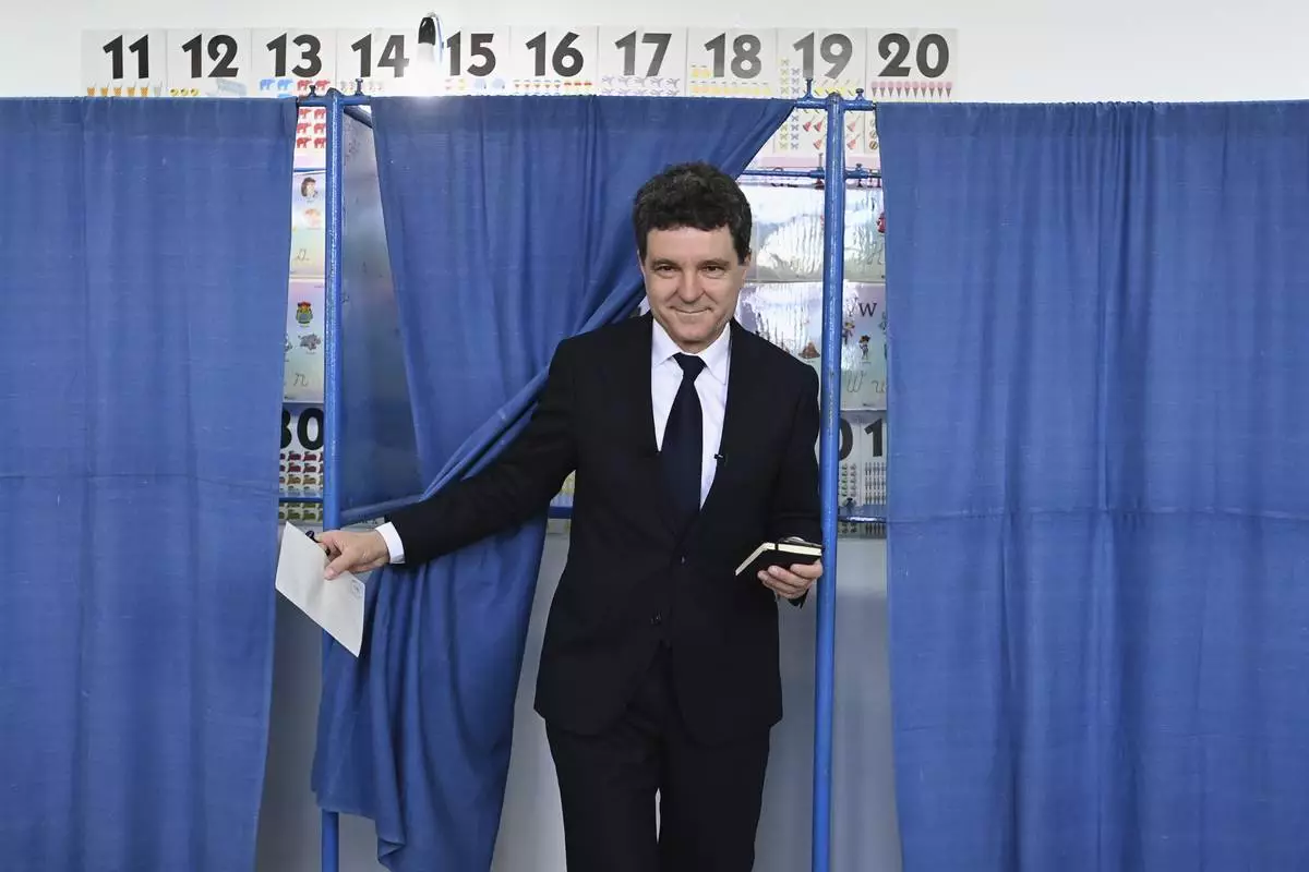Presidential candidate Nicusor Dan exits a voting cabin before casting his vote in the second round of the country's presidential election redo in Fagaras, Romania, Sunday, May 18, 2025. (AP Photo/Eduard Vinatoru)
