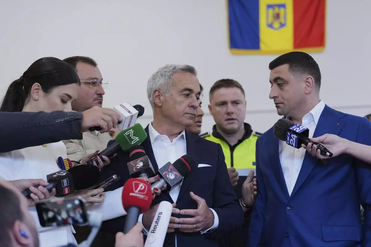 Presidential candidate George Simion, right, and Calin Georgescu, winner of the first round of last year's annulled election, speak to the media after casting their votes in the second round of the country's presidential election redo in Mogosoaia, Romania, Sunday, May 18, 2025. (AP Photo/Andreea Alexandru)