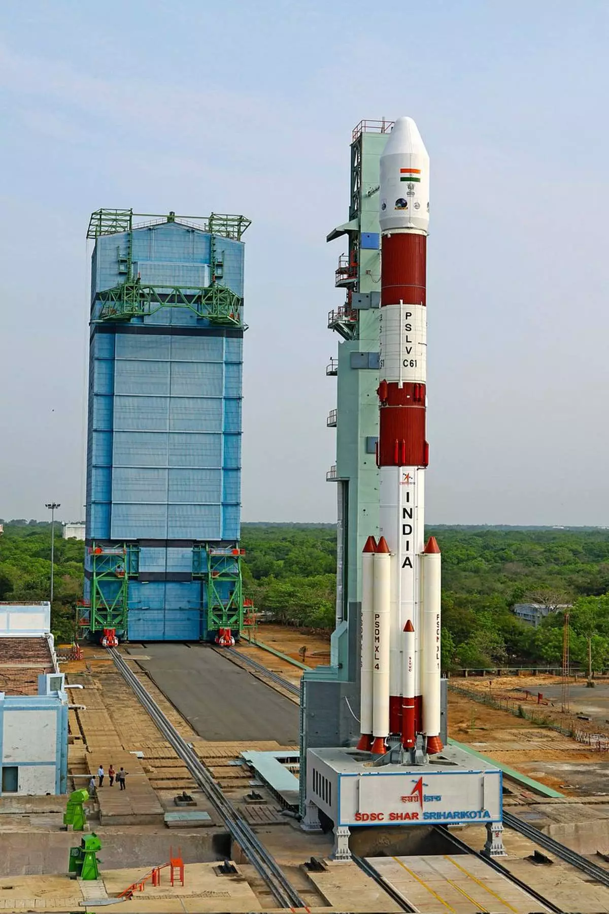 This photo released by Indian Space Research Organization shows the EOS-09 Earth observation satellite on board the PSLV-C61 launch vehicle at Sriharikota space center in southern India, Saturday, May 17, 2025. (Indian Space Research Organization via AP)