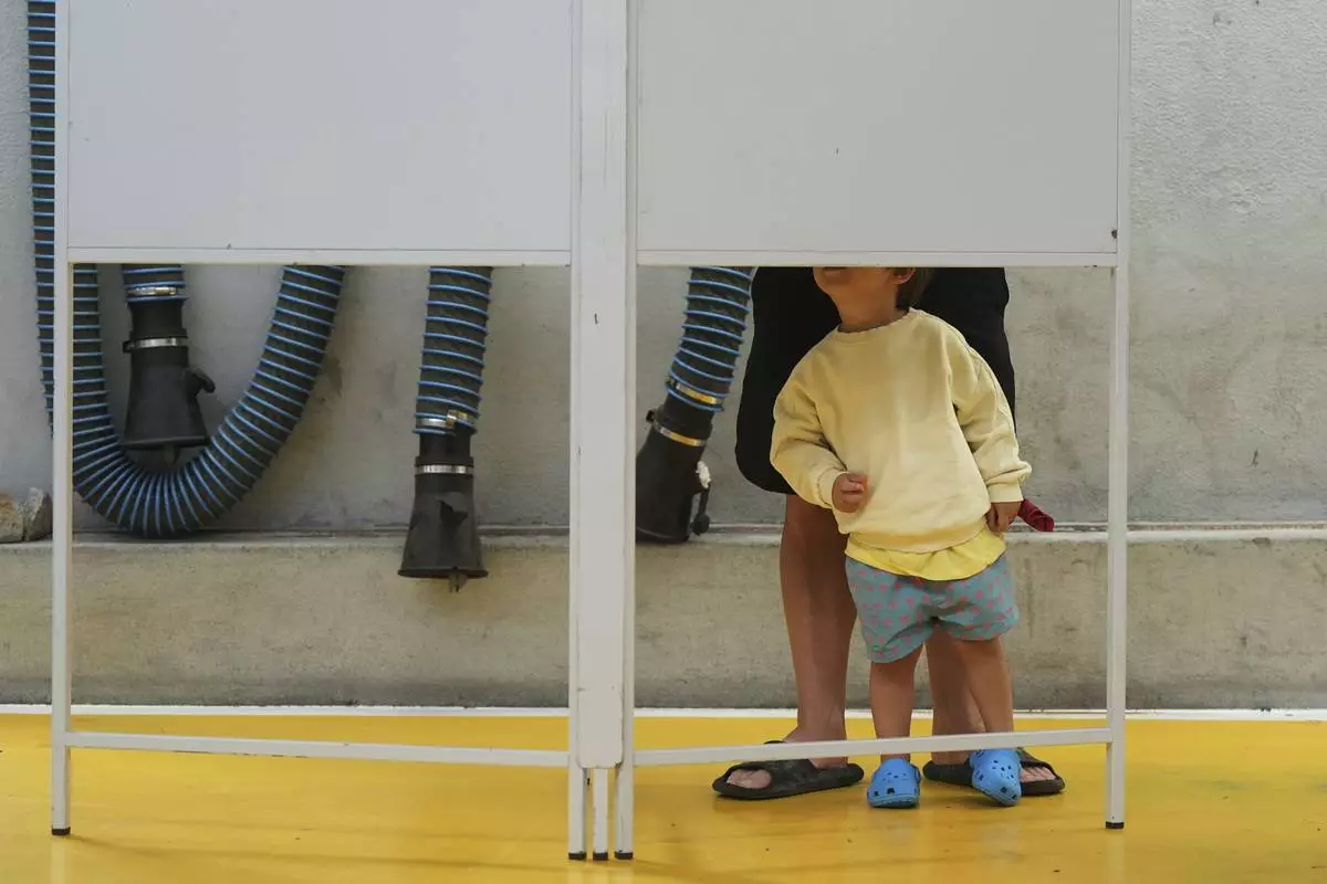 A child watches a voter fill their ballot in Portugal's general election at polling station in Lisbon, Sunday, May 18, 2025. (AP Photo/Ana Brigida)