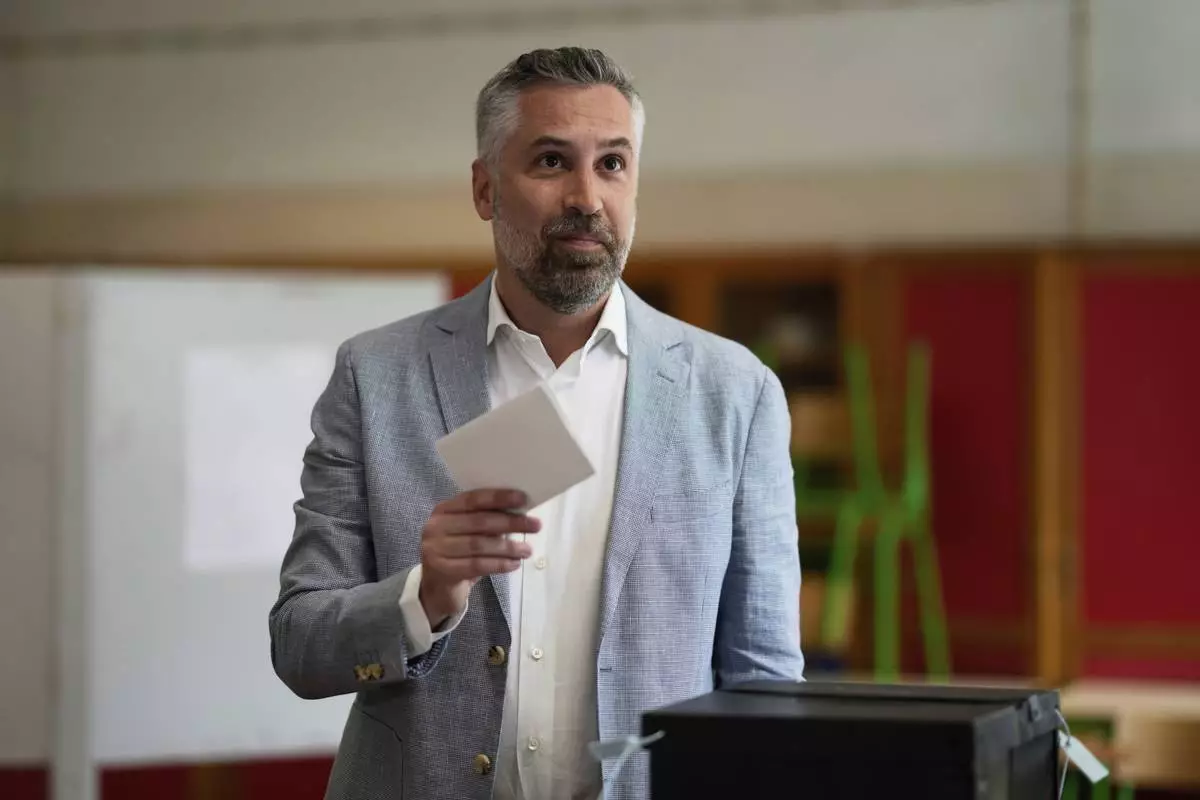 Socialist Party secretary general Pedro Nuno Santos holds his ballot when voting in Portugal's general election at a polling station in Lisbon, Sunday, May 18, 2025. (AP Photo/Armando Franca)