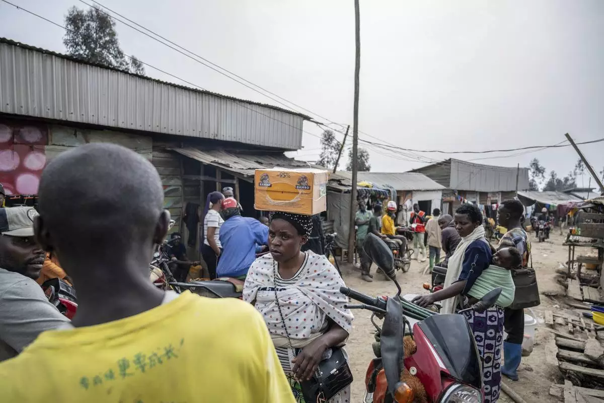 People walk through the town near the coltan mining quarry in Rubaya, Democratic Republic of Congo, on Friday, May 9, 2025. (AP Photo/Moses Sawasawa)
