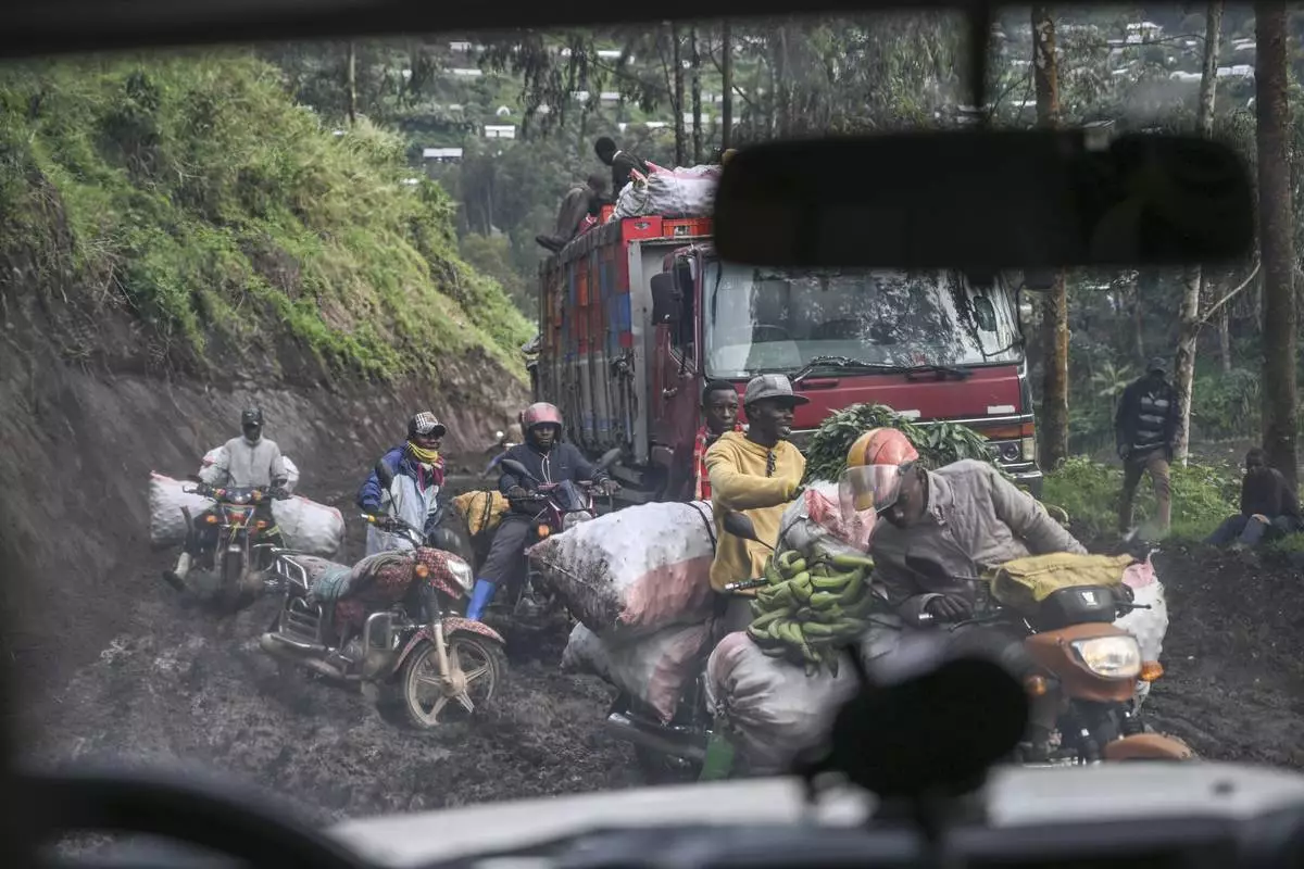 Motorcyclists ride through thick mud on their way to the mining town of Rubaya, Democratic Republic of Congo, on Friday, May 9, 2025. (AP Photo/Moses Sawasawa)