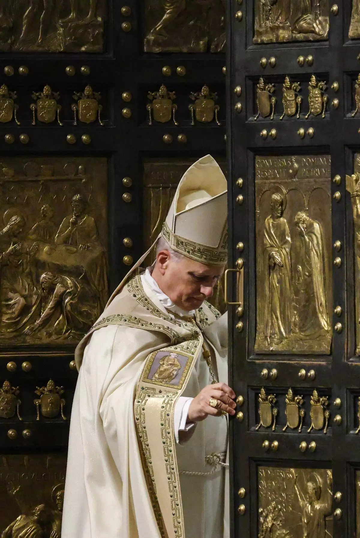 Pope Leo XIV closes St. Peter's Basilica Holy Door to end the 2025 ordinary Jubilee year, at the Vatican, Tuesday, Jan. 6, 2025. (Yara Nardi/Pool photo via AP)