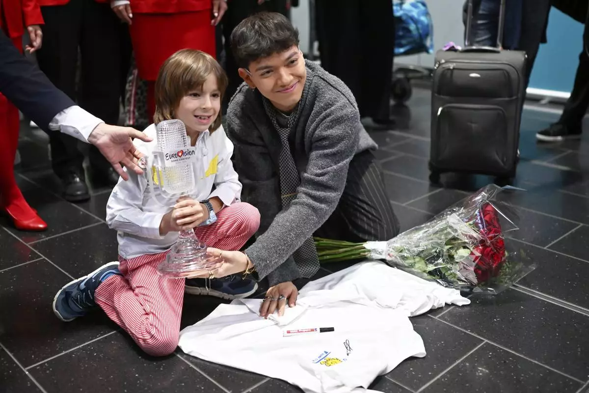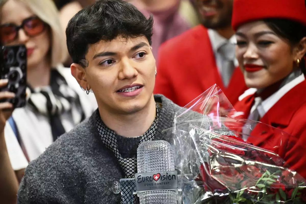 JJ, right, from Austria arrives at the airport in Vienna, Austria, Sunday, May 18, 2025, after winning the Grand Final of the 69th Eurovision Song Contest, in Basel yesterday. (AP Photo/Denes Erdos)