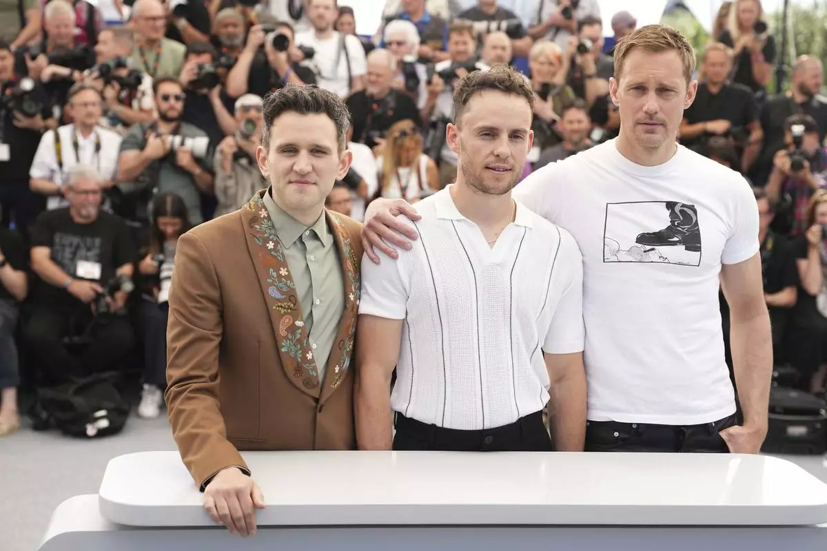 Harry Melling, from left, director Harry Lighton and Alexander Skarsgard pose for photographers at the photo call for the film 'Pillion' at the 78th international film festival, Cannes, southern France, Sunday, May 18, 2025. (Photo by Scott A Garfitt/Invision/AP)