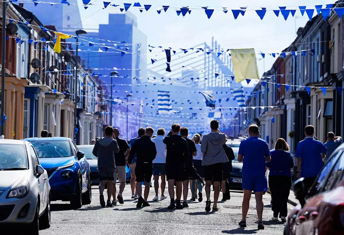 Everton fans make their way to the stadium before the English Premier League soccer match between Everton and Southampton, the last to be played at Goodison Park, Liverpool, England, Sunday, May 18, 2025. (Martin Rickett/PA via AP)