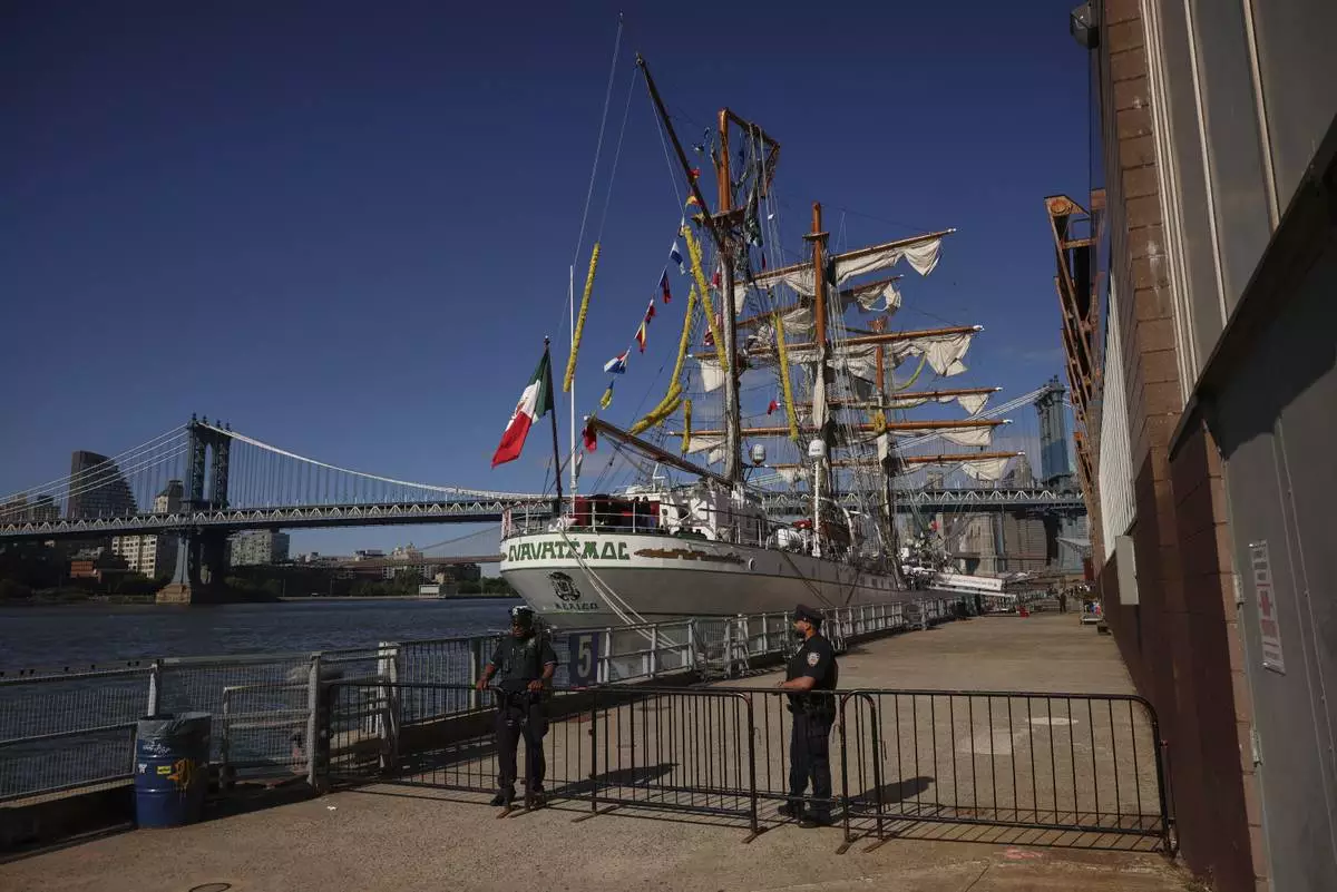New York Police officers stands watch on Pier 35 where the Cuauhtémoc, a masted Mexican Navy training ship that collided with the Brooklyn Bridge the night before, sits docked. (AP Photo/Yuki Iwamura)