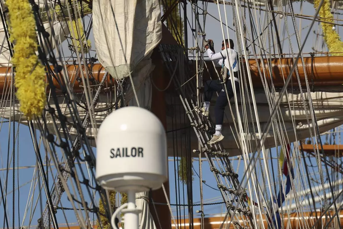 While docked at Pier 35, Sunday, May 18, 2025 in New York, a sailor climbs the mast rigging on the Cuauhtémoc, a masted Mexican Navy training ship that collided with the Brooklyn Bridge the night before. (AP Photo/Yuki Iwamura)