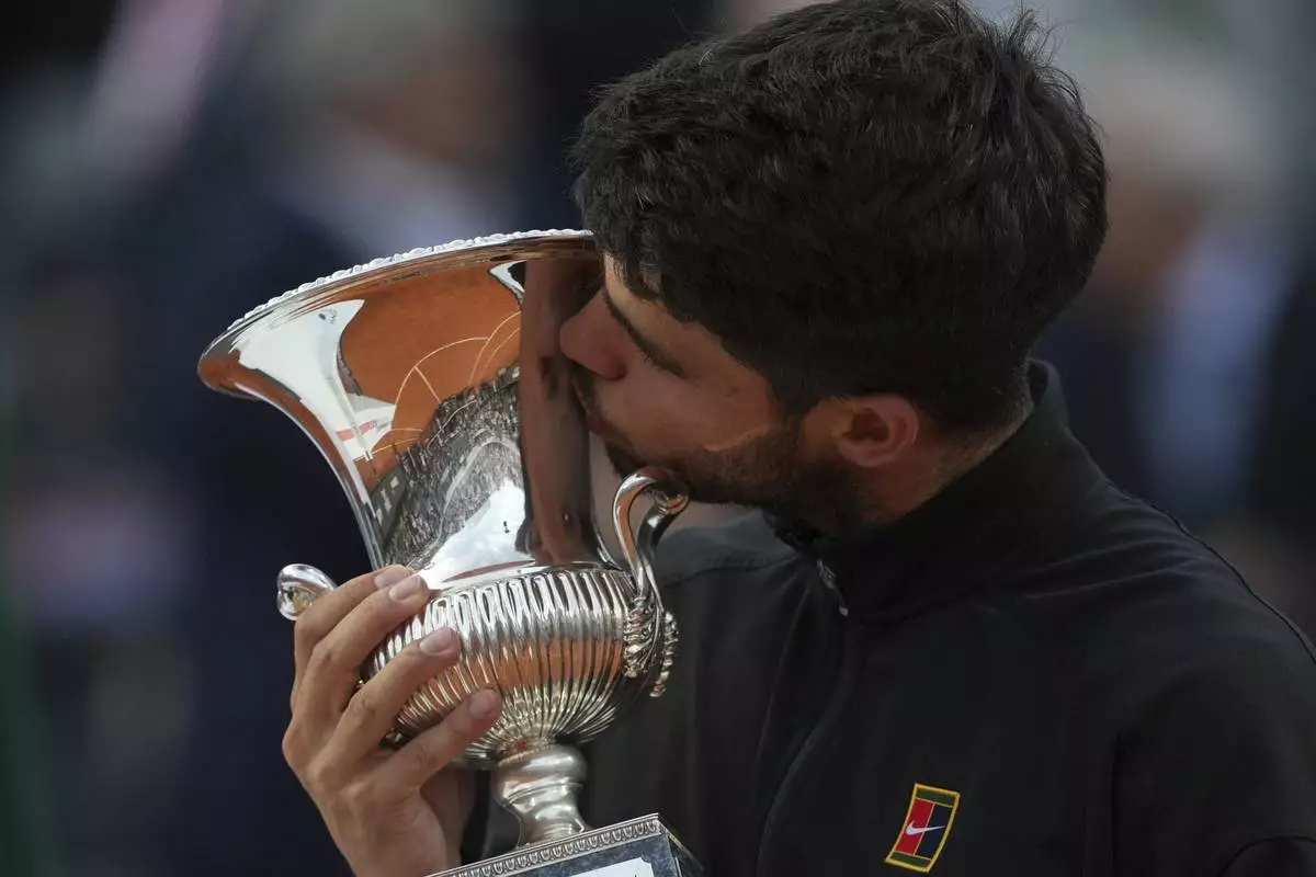 Carlos Alcaraz of Spain, kisses the trophy after winning the Italian Open tennis tournament at the Foro Italico in Rome, Sunday, May 18, 2025. (AP Photo/Alessandra Tarantino)