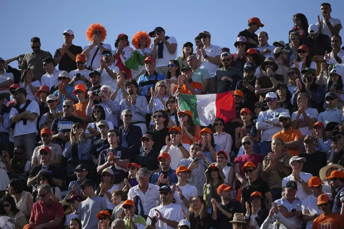 Italian fans cheer for Jannik Sinner during a final tennis match against Carlos Alcaraz of Spain in the Italian Open at the Foro Italico in Rome, Sunday, May 18, 2025. (AP Photo/Alessandra Tarantino)