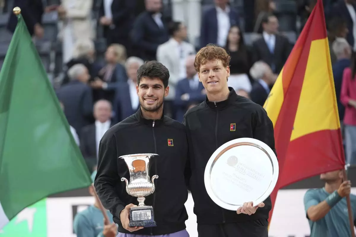Carlos Alcaraz of Spain, left, and Jannik Sinner of Italy pose for the photographers after their final tennis match in the Italian Open at the Foro Italico in Rome, Sunday, May 18, 2025. (AP Photo/Alessandra Tarantino)