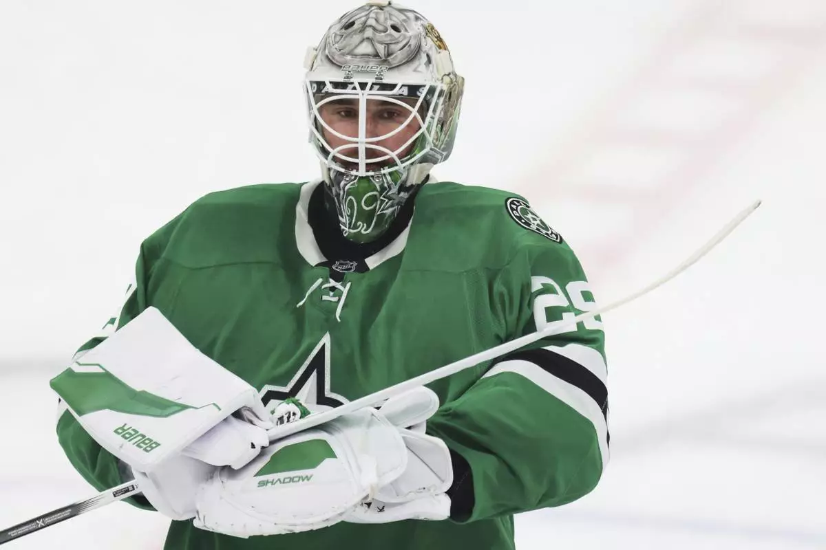 Dallas Stars goaltender Jake Oettinger warms up before Game 6 of a second-round NHL hockey playoff series against the Winnipeg Jets in Dallas, Saturday, May 17, 2025. (AP Photo/Gareth Patterson)