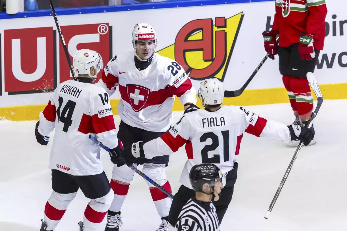 Switzerland's forward Timo Meier, center, celebrates his goal with his teammates Dean Kukan, left and Kevin Fiala, center right after scoring, during the IIHF 2025 World Championship preliminary round group B game between Hungary and Switzerland, at the Jyske Bank Boxen, in Herning, Denmark, Sunday, May 18, 2025. (Salvatore Di Nolfi/Keystone via AP)