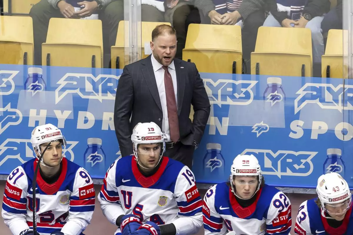 Ryan Warsofsky, head coach of USA national ice hockey team looks on, during the IIHF 2025 World Championship preliminary round group B game between Kazakhstan and USA, at the Jyske Bank Boxen, in Herning, Denmark, Sunday, May 18, 2025. (Salvatore Di Nolfi/Keystone via AP)
