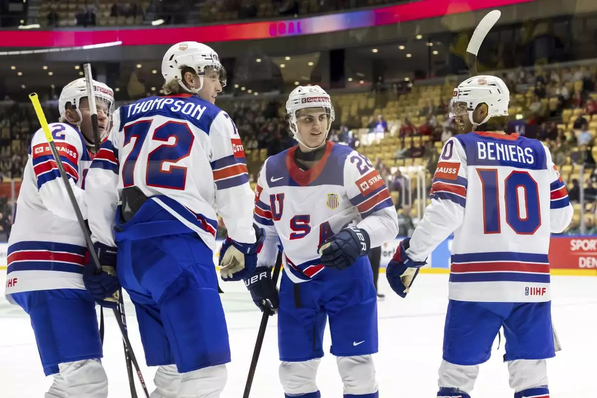 USA's Tage Thompson, 2nd left, celebrates his goal with teammates, Jackson Lacombe, left, Zeev Buium, 2nd right, and Matty Beniers, right, during the IIHF 2025 World Championship preliminary round group B game between Kazakhstan and USA, at the Jyske Bank Boxen, in Herning, Denmark, Sunday, May 18, 2025. (Salvatore Di Nolfi/Keystone via AP)