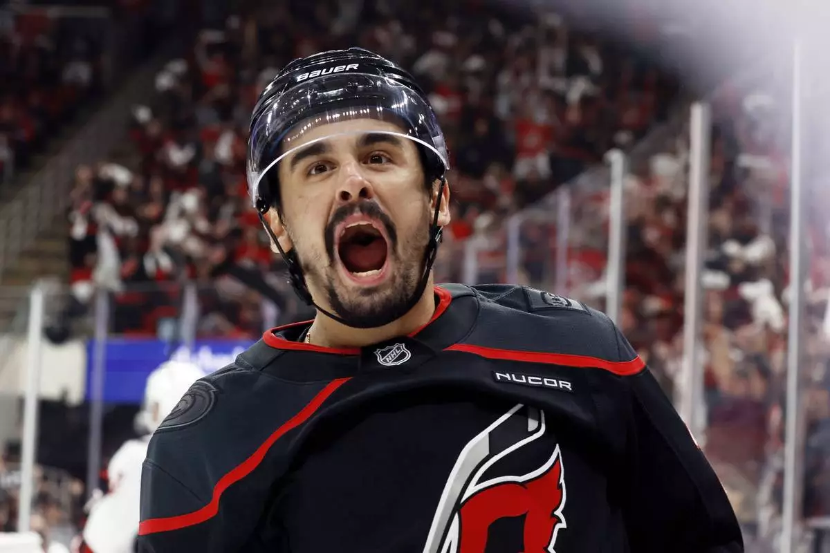 Carolina Hurricanes' Seth Jarvis celebrates after his goal against the Washington Capitals during the second period of Game 4 of a second-round NHL hockey playoff series in Raleigh, N.C., Monday, May 12, 2025. (AP Photo/Karl DeBlaker)