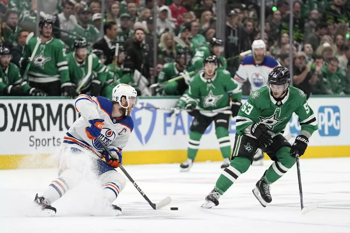 FILE - Edmonton Oilers center Connor McDavid (97) works to get the puck past Dallas Stars center Wyatt Johnston (53) during the first period of Game 1 of the Western Conference finals in the NHL hockey Stanley Cup playoffs, May 23, 2024, in Dallas. (AP Photo/Tony Gutierrez, File)