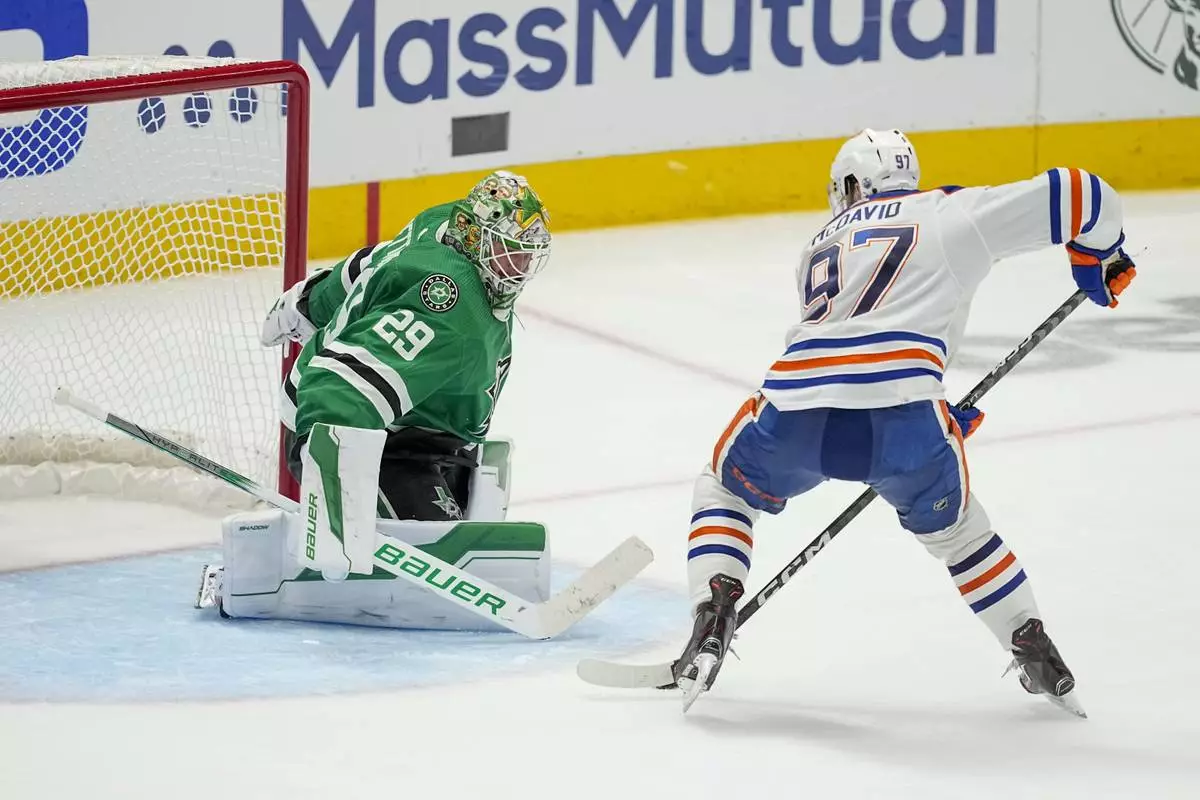 FILE - Edmonton Oilers center Connor McDavid (97) prepares to shoot against Dallas Stars goaltender Jake Oettinger (29) during overtime in Game 1 of the NHL hockey Western Conference Stanley Cup playoff finals, May 23, 2024, in Dallas. (AP Photo/Tony Gutierrez, File)