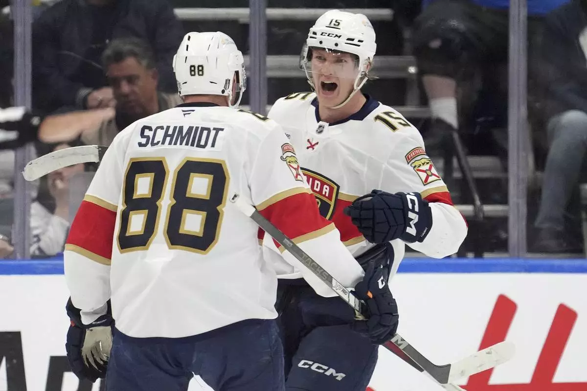 Florida Panthers center Anton Lundell (15) celebrates affter his goal with teammate Nate Schmidt (88) during the second period of Game 7 of a second-round NHL hockey playoff series against the Toronto Maple Leafsin Toronto, Sunday, May 18, 2025. (Frank Gunn/The Canadian Press via AP)