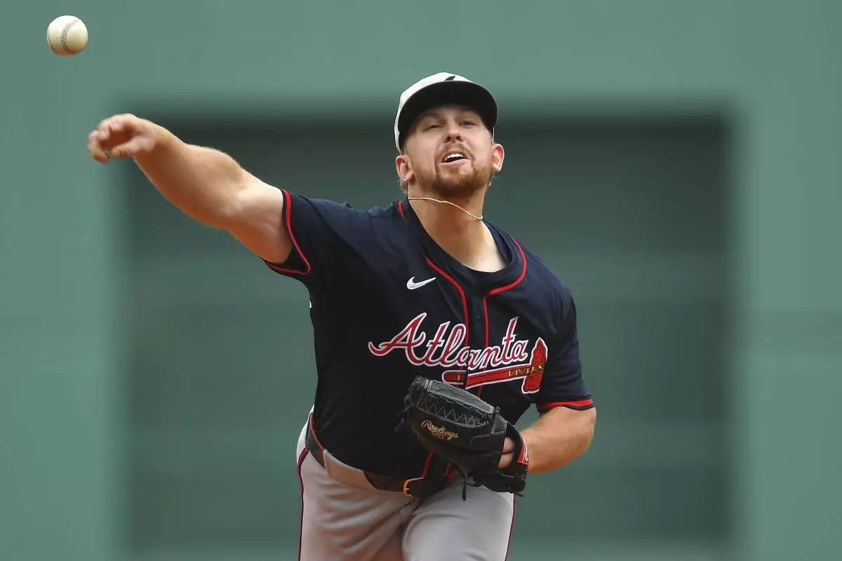 Atlanta Braves' Spencer Schwellenbach delivers a pitch to a Boston Red Sox batter in the first inning of a baseball game, Sunday, May 18, 2025, in Boston. (AP Photo/Steven Senne)