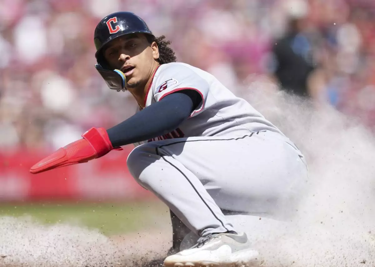 Cleveland Guardians' Bo Naylor scores on a single hit by Carlos Santana during the seventh inning of a baseball game against the Cincinnati Reds, Sunday, May 18, 2025, in Cincinnati. (AP Photo/Jeff Dean)