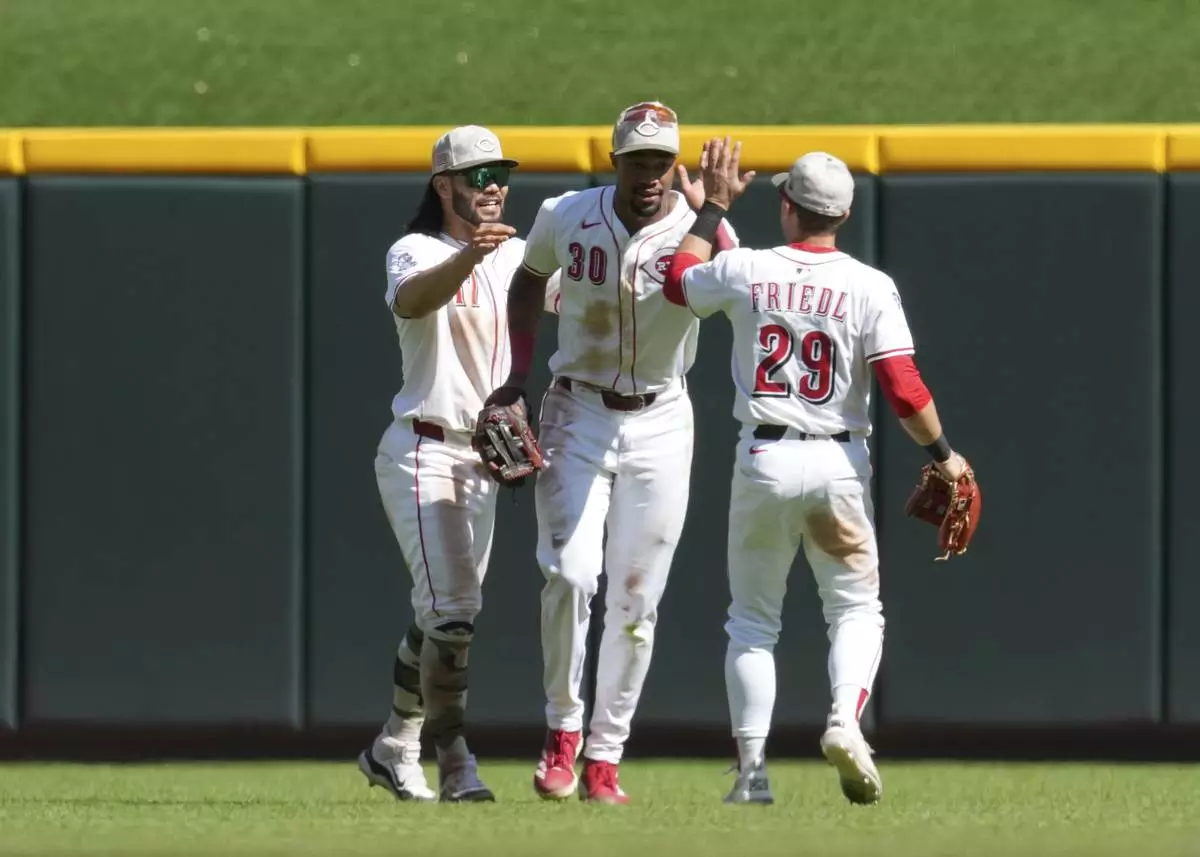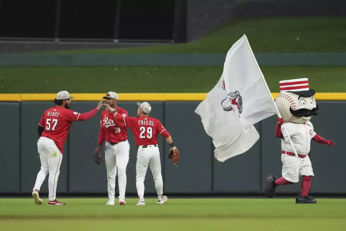 Cincinnati Reds' Rece Hinds (57) celebrates with teammates Will Benson (30) and TJ Friedl (29) following a baseball game against the Cleveland Guardians, Saturday, May 17, 2025, in Cincinnati. (AP Photo/Jeff Dean)