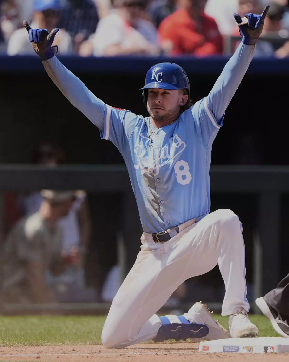 Kansas City Royals' Drew Waters (8) celebrates on third after hitting a triple during the seventh inning of a baseball game against the St. Louis Cardinals, Sunday, May 18, 2025, in Kansas City, Mo. (AP Photo/Charlie Riedel)