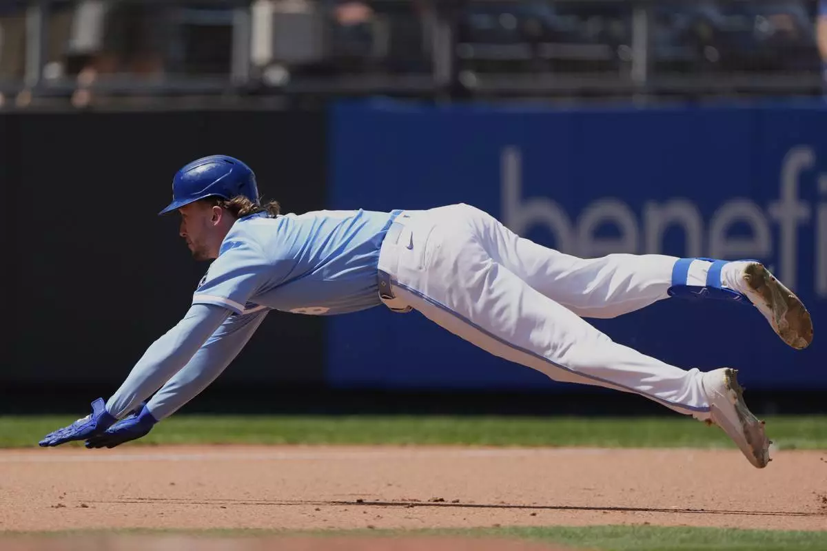 Kansas City Royals' Drew Waters dives to third after hitting a triple during the seventh inning of a baseball game against the St. Louis Cardinals, Sunday, May 18, 2025, in Kansas City, Mo. (AP Photo/Charlie Riedel)