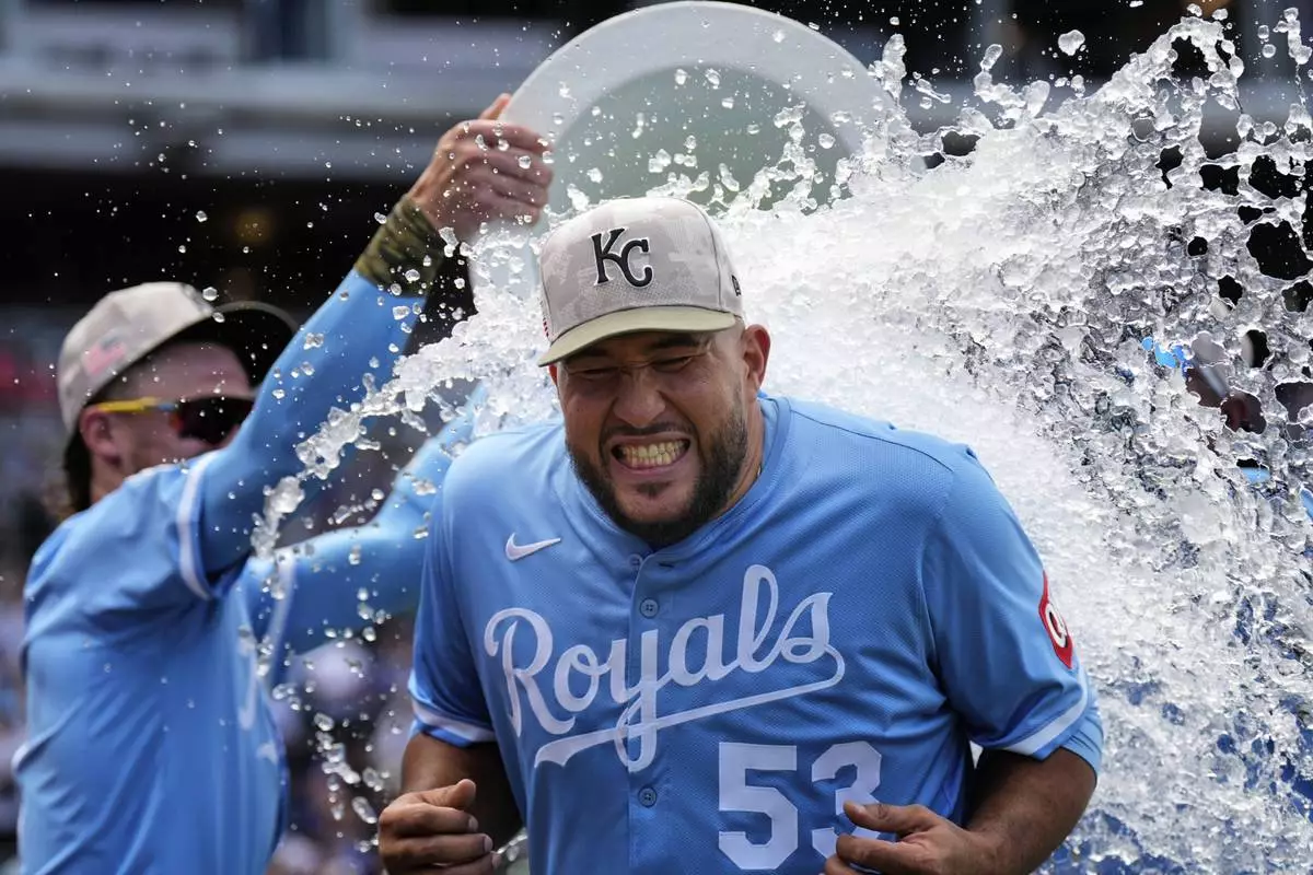 Kansas City Royals relief pitcher Carlos Estevez is doused by teammates after their baseball game against the St. Louis Cardinals, Sunday, May 18, 2025, in Kansas City, Mo. (AP Photo/Charlie Riedel)