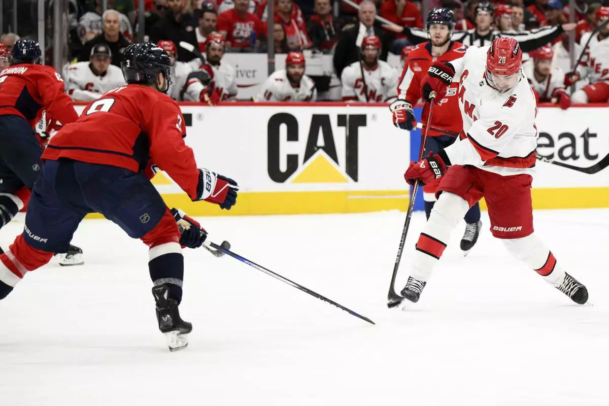 Carolina Hurricanes center Sebastian Aho (20) shoots the puck against Washington Capitals defenseman Matt Roy (3) in the second period of Game 2 of a second-round NHL hockey playoff series Thursday, May 8, 2025, in Washington. (AP Photo/Nick Wass)
