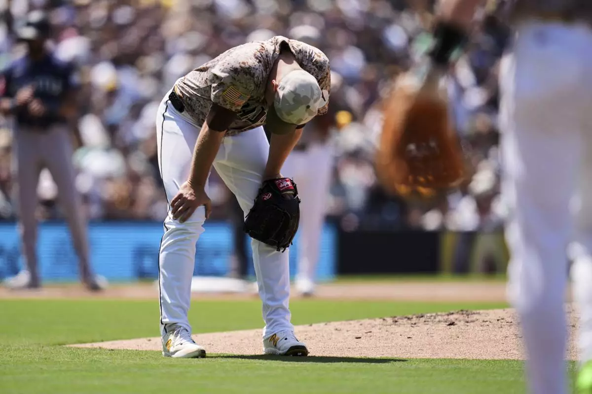 San Diego Padres starting pitcher Michael King looks down after an RBI single hit by Seattle Mariners' Miles Mastrobuoni deflected off him during the fourth inning of a baseball game Sunday, May 18, 2025, in San Diego. (AP Photo/Gregory Bull)