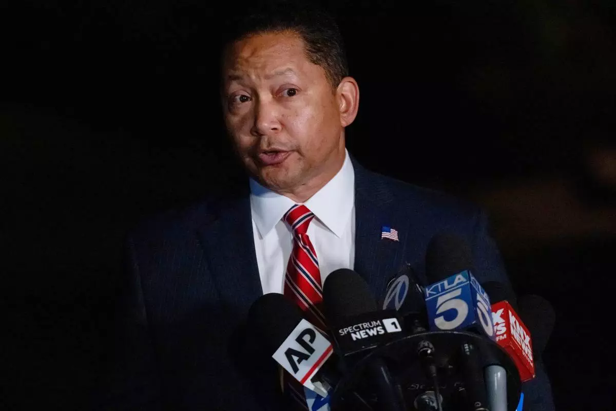 LAPD Deputy Chief Alan Hamilton speaks near Rob Reiner's residence Sunday, Dec. 14, 2025, in the Brentwood section of Los Angeles. (AP Photo/Ethan Swope)