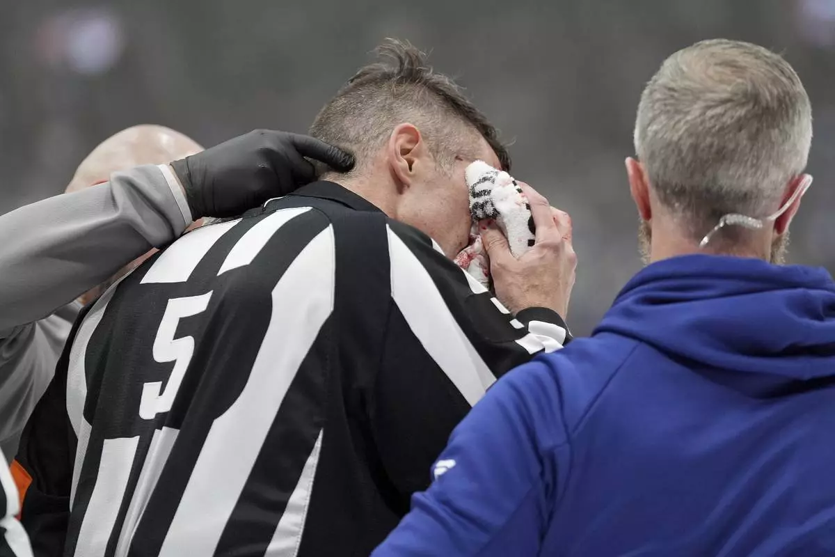 Referee Chris Rooney (5) is tended to as he is escorted off the ice after receiving an injury from being clipped by a player during the first period of Game 7 of a second-round NHL hockey playoff series between the Florida Panthers and the Toronto Maple Leafs in Toronto, Sunday, May 18, 2025. (Frank Gunn/The Canadian Press via AP)