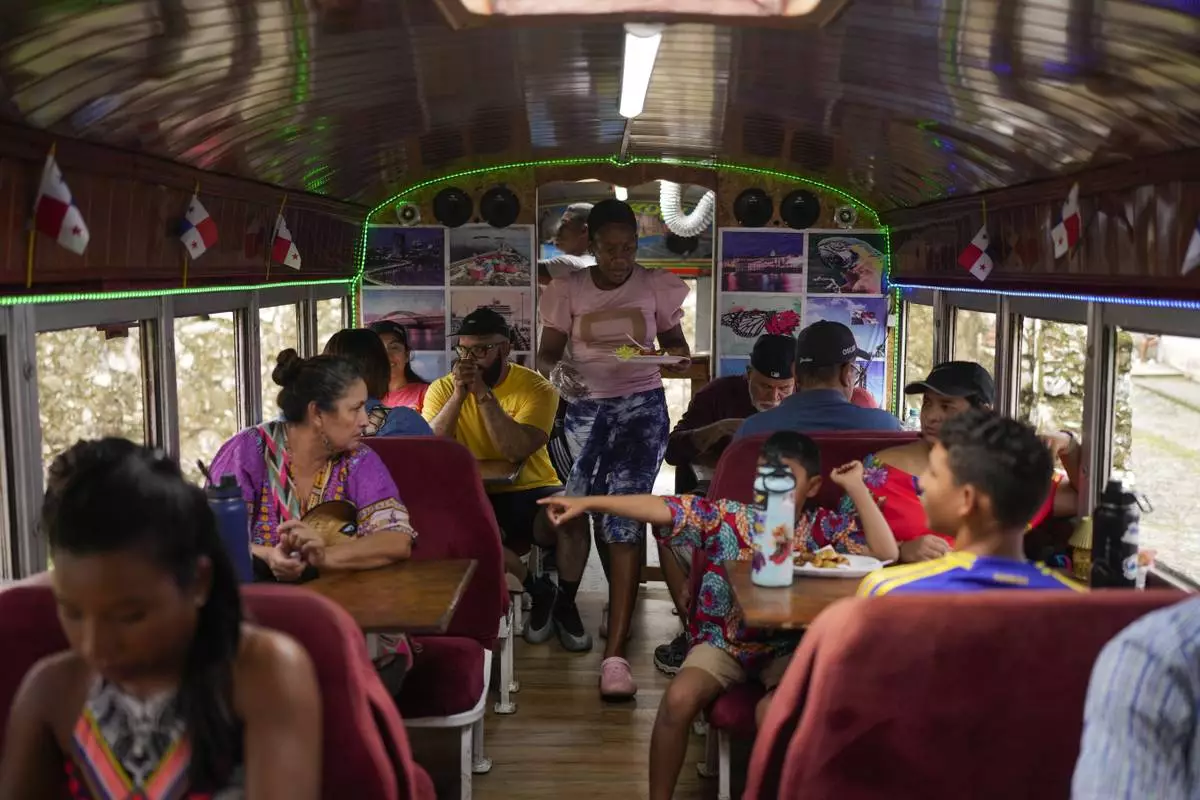 A waitress serves patrons inside a Red Devil restaurant in Portobelo, Panama, Saturday, May 3, 2025. The Red Devils are former U.S. school buses once used in the Panama Canal Zone and later as public transport, now adapted for private and cultural use. (AP Photo/Matias Delacroix)