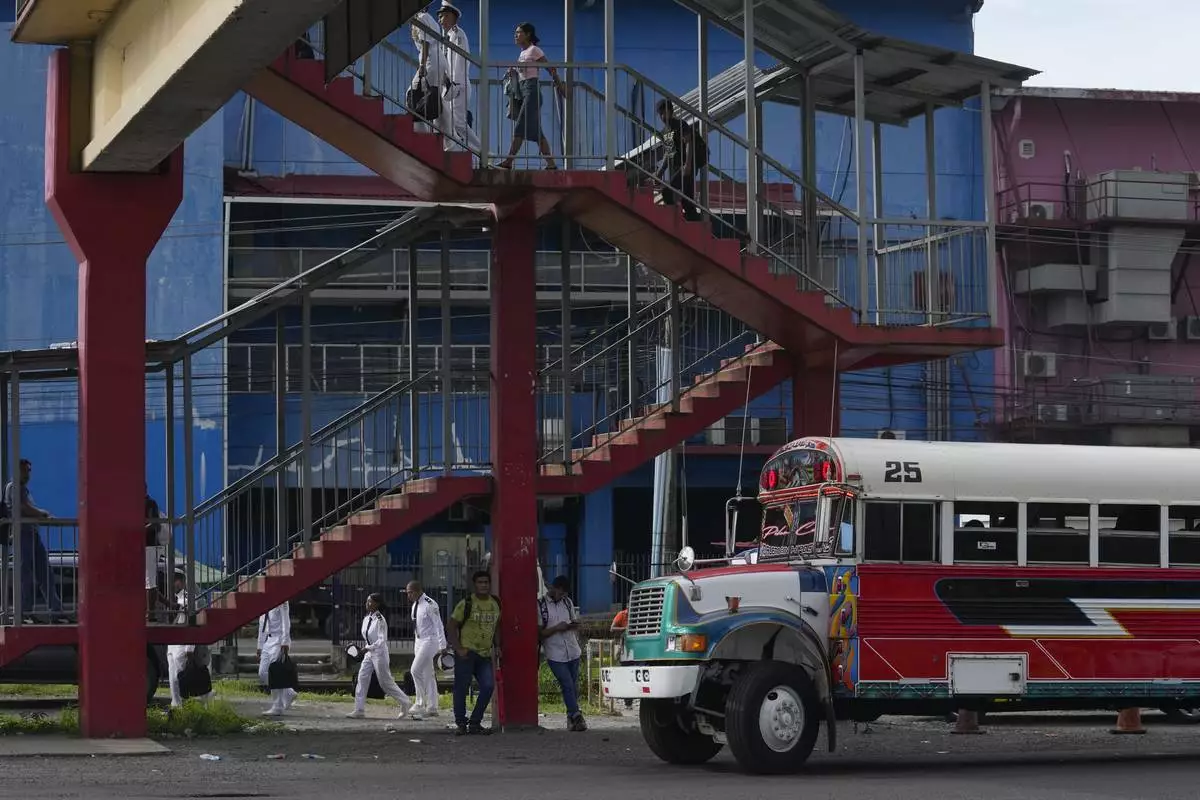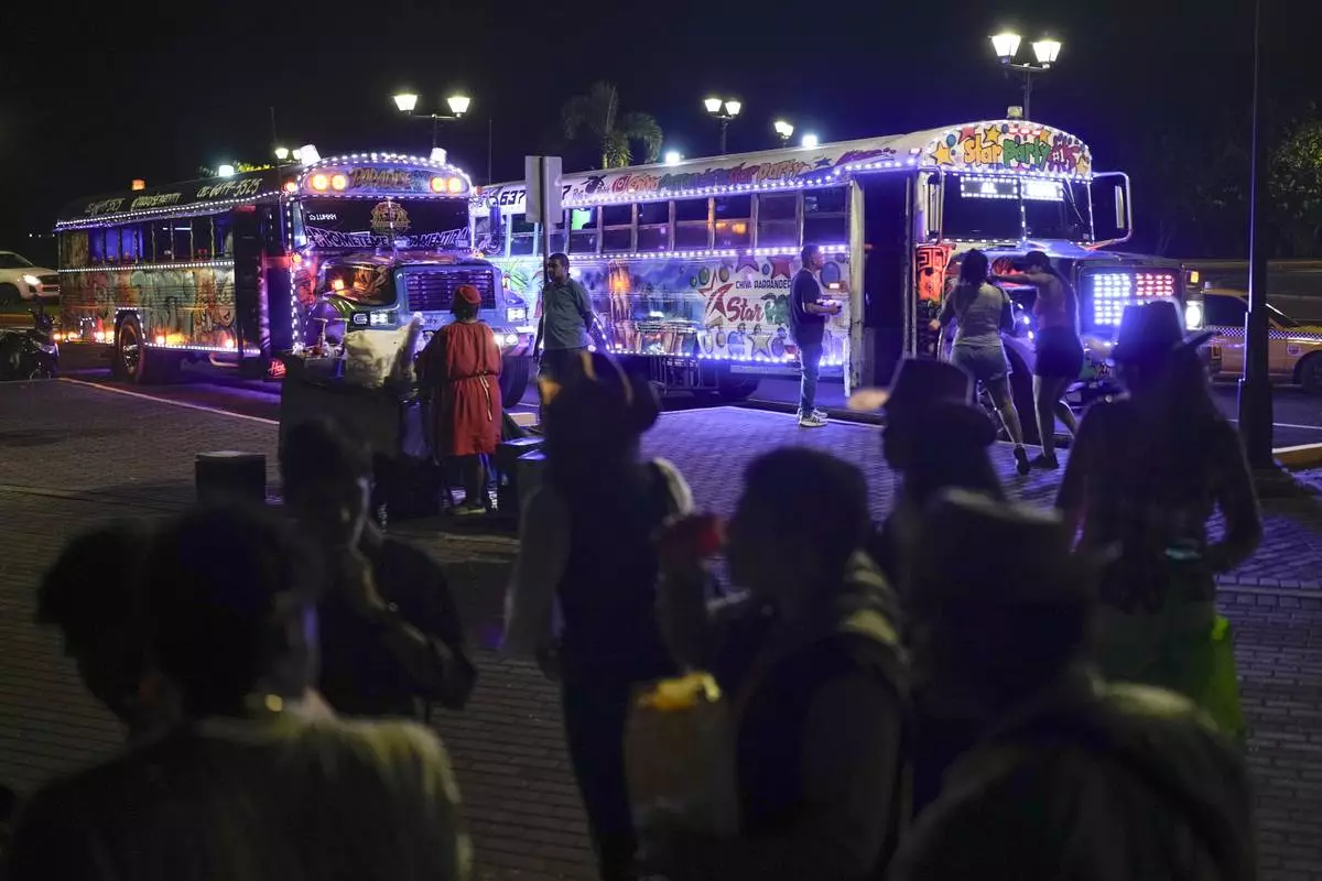 People wait to board a Red Devil party bus in Panama City, Saturday, May 17, 2025. (AP Photo/Matias Delacroix)
