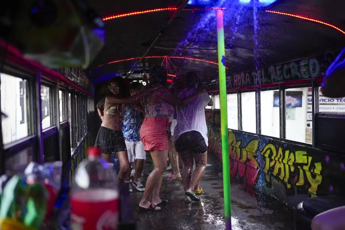 People dance inside a Red Devil party bus in Panama City, Sunday, Aug. 25, 2024. The Red Devils are former U.S. school buses once used in the Panama Canal Zone and later as public transport, now repurposed for private and cultural use. (AP Photo/Matias Delacroix)