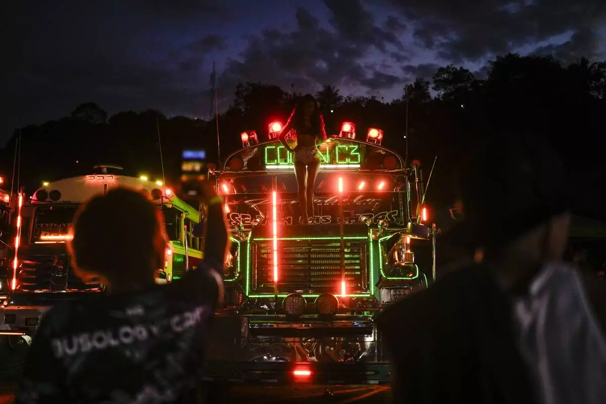 A woman sits on speakers playing music during a Red Devils bus exhibition in La Chorrera, Panama, Sunday, June 30, 2024. The Red Devils are former U.S. school buses once used in the Panama Canal Zone and later as public transport, now adapted for private and cultural use. (AP Photo/Matias Delacroix)