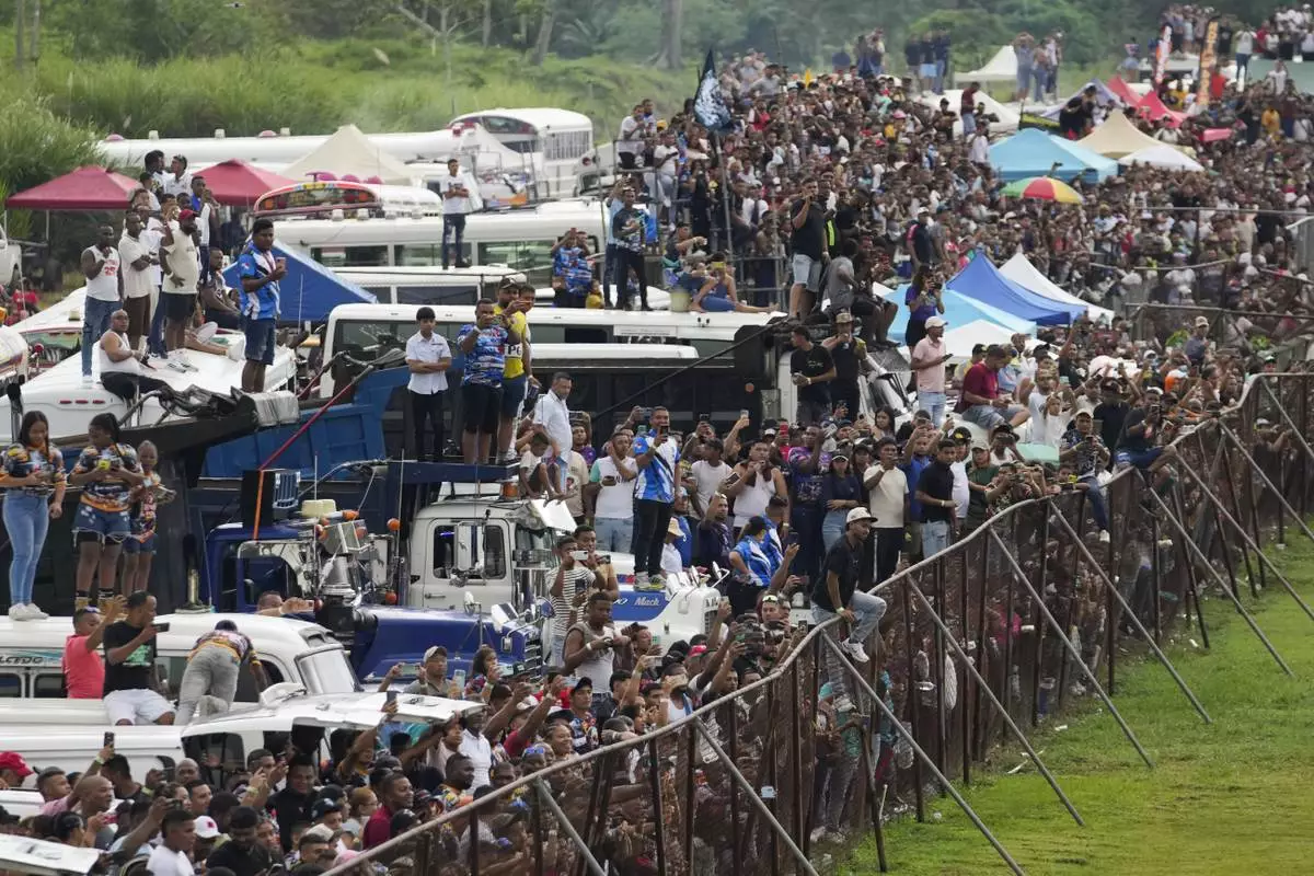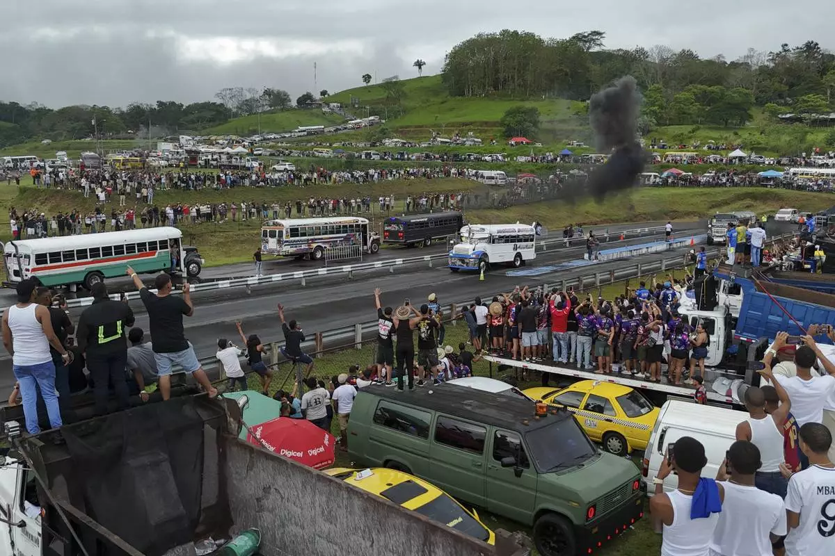 Spectators watch Red Devil buses race at a track in La Chorrera, Panama, Sunday, May 18, 2025. Red Devils are former U.S. school buses once used in the Panama Canal Zone, later repurposed as public transport or adapted for private and cultural use. (AP Photo/Matias Delacroix)