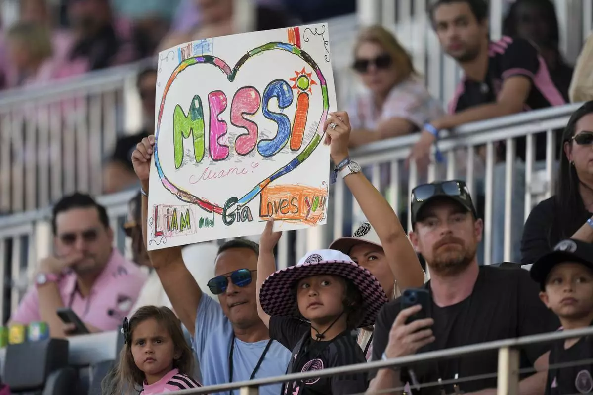Fans hold up a sign supporting Inter Miami forward Lionel Messi at the start of an MLS soccer match between Inter Miami and Orlando City, Sunday, May 18, 2025, in Fort Lauderdale, Fla. (AP Photo/Rebecca Blackwell)