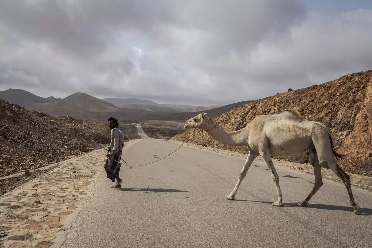 A camel herder crosses the road on the Yemeni island of Socotra on Sept. 23, 2024. (AP Photo/Annika Hammerschlag)