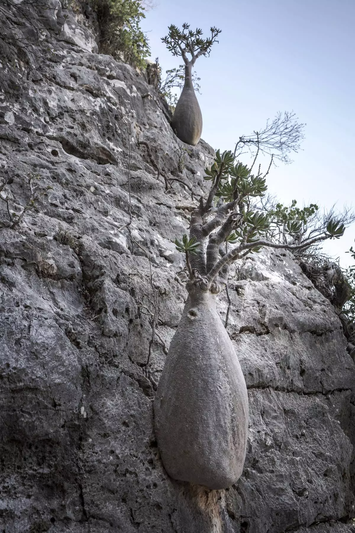 A bottle tree grows from a cliff face on the Yemeni island of Socotra, Sept. 21, 2024. (AP Photo/Annika Hammerschlag)