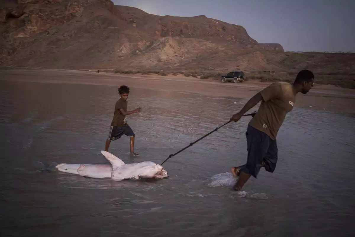 A fisherman drags a shark to shore on the Yemeni island of Socotra on Sept. 17, 2024. (AP Photo/Annika Hammerschlag)