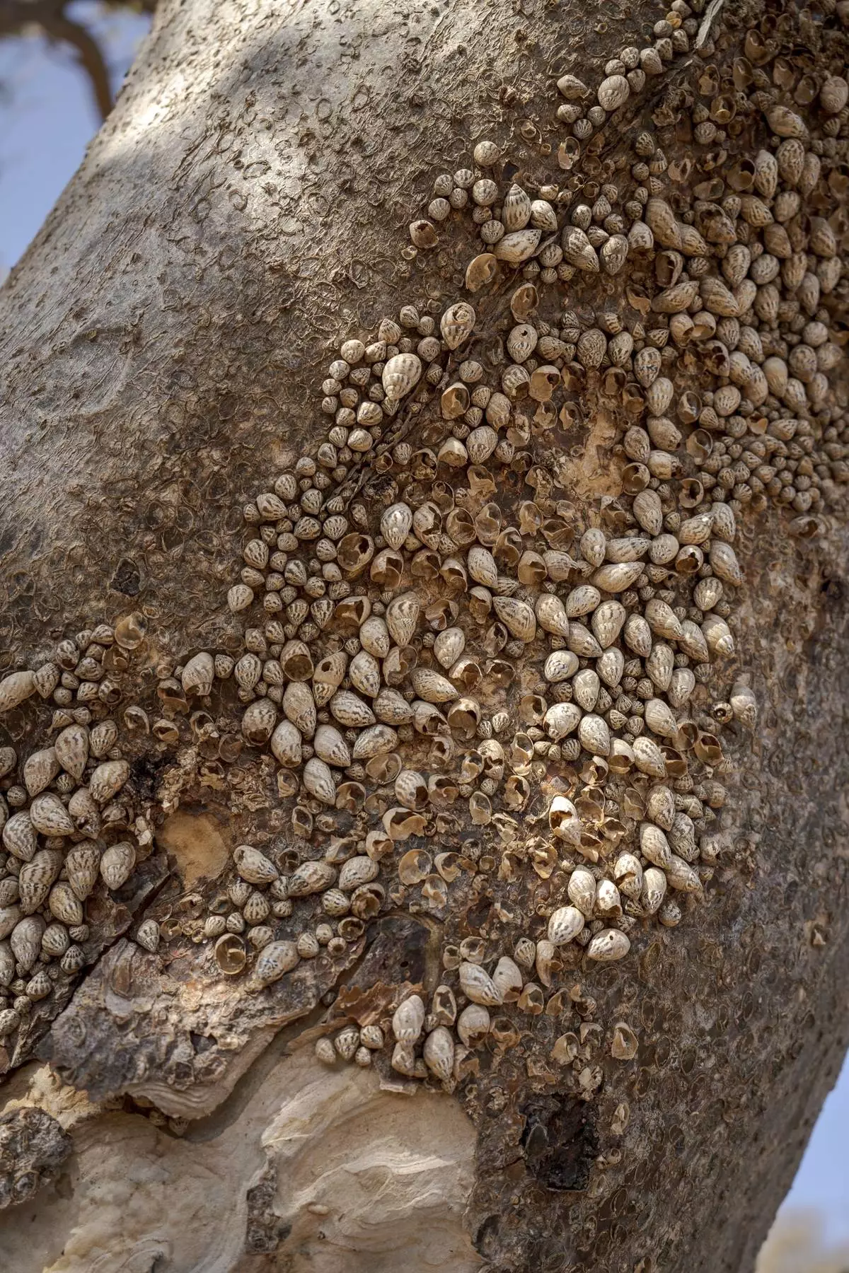 Achatinelloides mollusks gather on a tree's bark on the Yemeni island of Socotra, Sept. 22, 2024. (AP Photo/Annika Hammerschlag)
