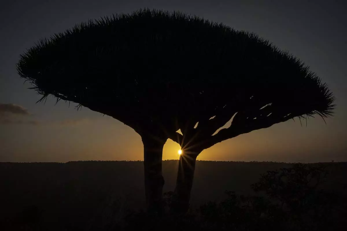 The sunrise appears between the branches of a dragon's blood tree on the Yemeni island of Socotra, on Sept. 20, 2024. (AP Photo/Annika Hammerschlag)
